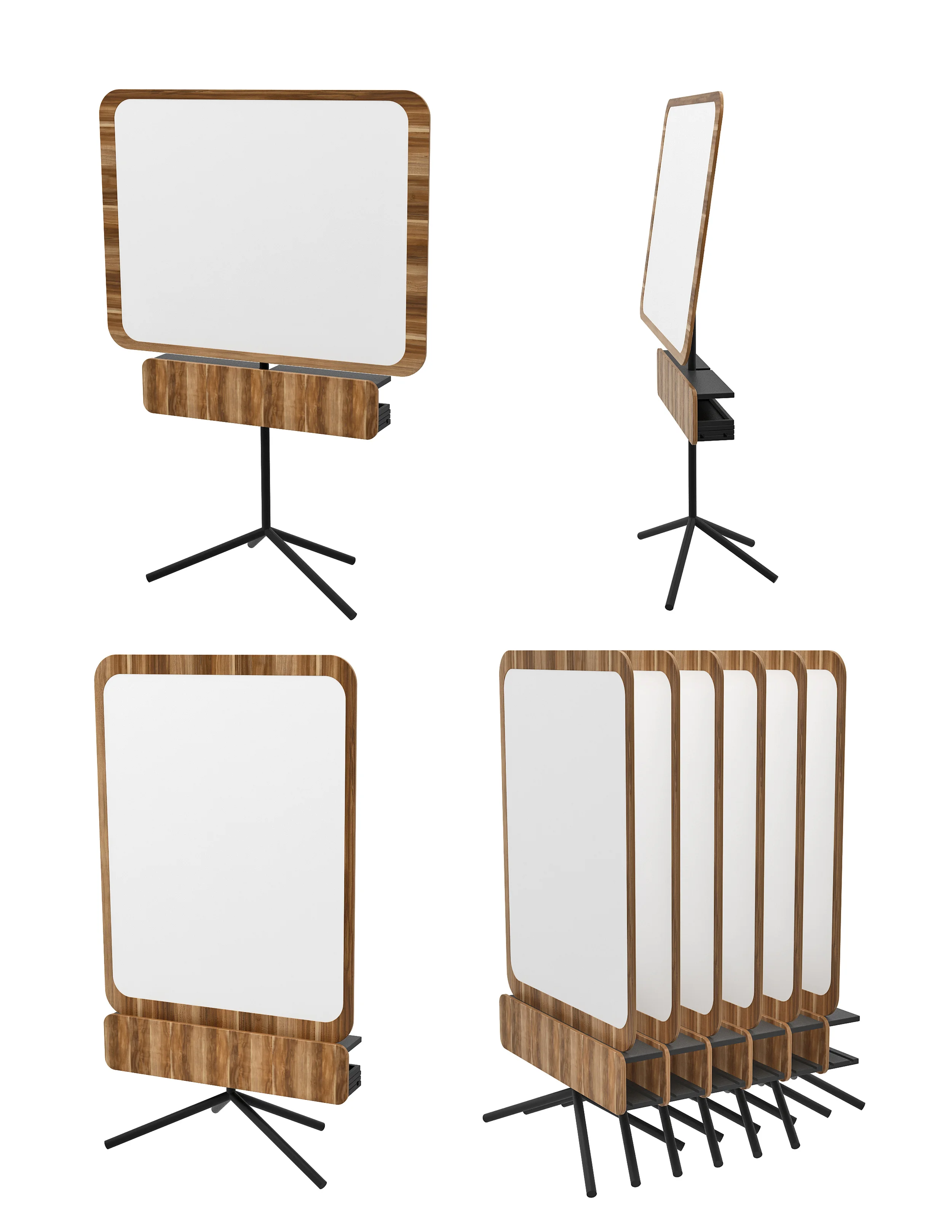 Configurable to portrait or landscape, tiltable and stackable to save space.