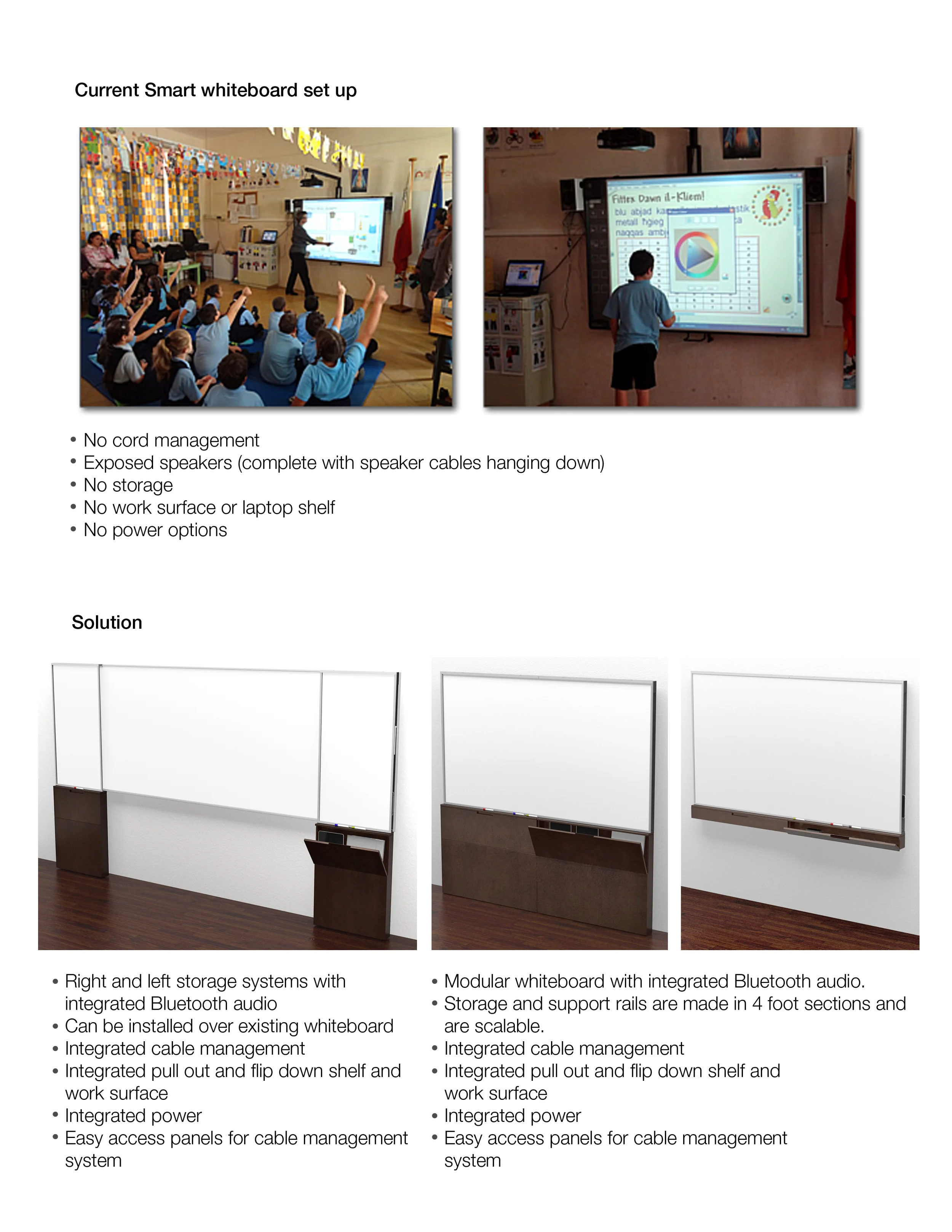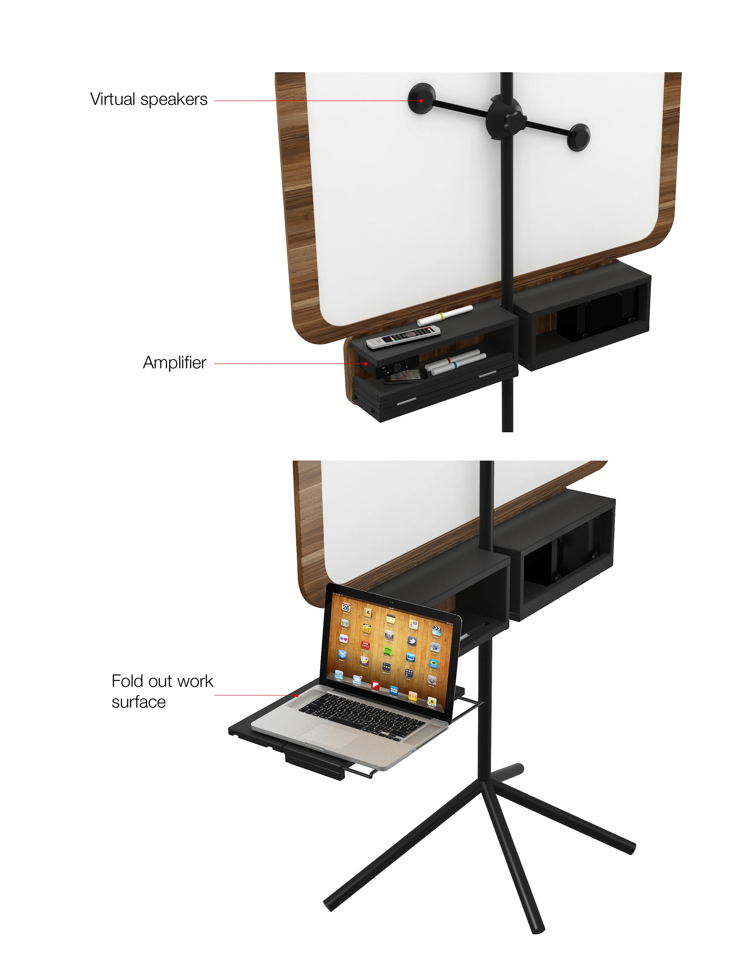 Designed for virtual and temporary offices and classrooms where space, ease of use and temporary usage are key features. The integrated Bluetooth audio system can be use with Smart projectors, used with a microphone or a big speaker for presentations.